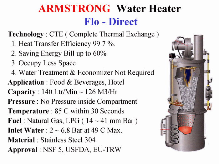 Armstrong Flo-Direct is Gas Fired Water Heater. It is the most efficient method of making Hot Water for Hotel, Hospital, Industrial due to CTE / Complete Thermal Exchange technology. The efficiency is 99.7 %. This means the Gas BTU is converted / used 99.7 % to make Hot Water. Most efficient method comparing to using Boiler + Calorifier + All Regulating Valves in creating Hot water or even using Hot water Boiler. It is safe unlike Boiler and no intake water treatment is required.