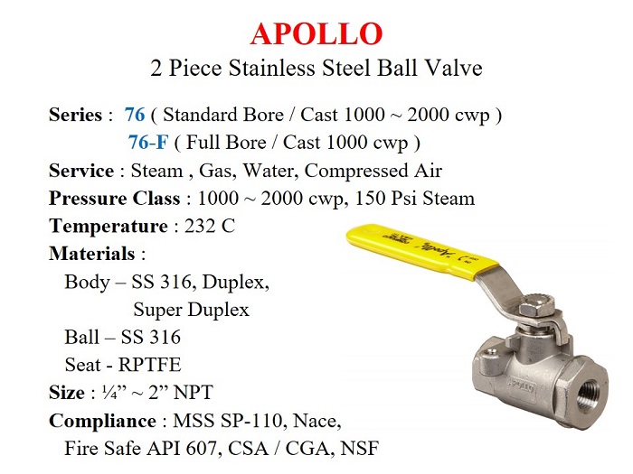Jual Apollo Stainless Steel Ball Valves series 76 & 76F / Standard & Full Bore, Two Pc Body, Drat 1/4" s/d 3" NPT. Pressure : 68 ~ 137 Bar CWP. Temp. 232 C / RPTFE Seat. Body / SS 316, Duplex, Super Duplex.