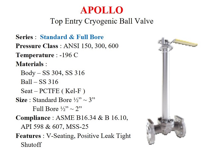 Jual Apollo Cryogenic Ball Valves / Temp. - 196 C, Top Mounted, Standard & Full Bore ANSI class 150, 300, 600 Flange connection 1/2" s/d 2". Body : SS 304 & 316. Seat : PCTFE / KEL-F. Special for LNG, Liquid Nitrogen, CO2 etc.