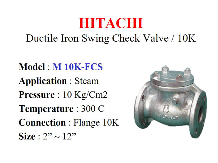 Jual Hitachi Ductile Iron Swing Check Valve JIS 10K, model M 10K-FCS, Bolted Bonnet, Koneksi Flange JIS 10K. Ukuran 2" s/d 12". Penggunaan untuk Uap / Steam dengan tekanan max. 10 Bar. Catatan : Bahan Ductile Iron lebih tahan Retak dibanding Cast Iron dimana Ideal untuk linkungan Pabrik2 / Industri pada installasi Pemipaan Utility seperti Uap / Steam, Udara / Compresed Air, Gas, Air / Water, Minyak / Oil dsb.