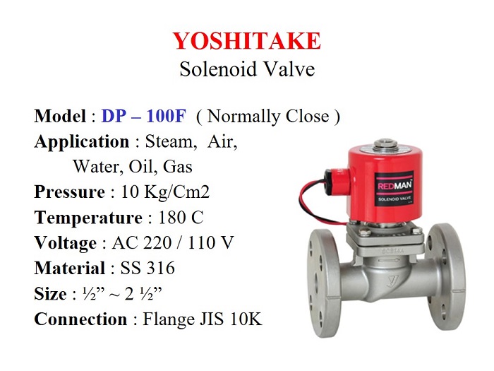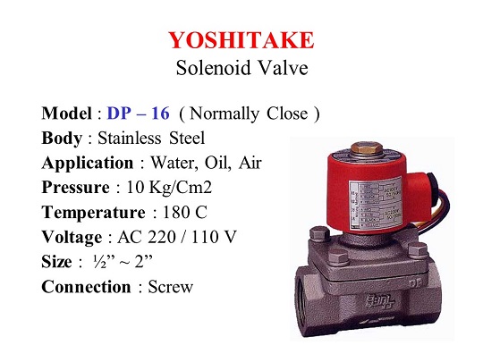 Jual Yoshitake Solenoid Valve DP-10 untuk Uap, Udara & Cairan dengan Tekanan 10 Bar dan Temperatur 180 C. Ukuran 3/8" s/d 2" Drat BSPT. Body / Bronze. Dual Voltage AC 220 / 110, Normally Close.